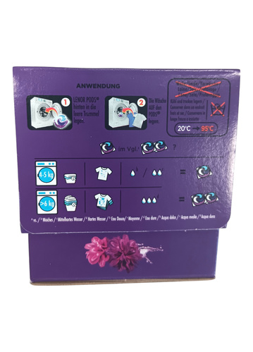 Lenor kapsułki przeznaczone do prania kolorowych tkanin, z wyjątkiem wełny i jedwabiu. Zapewnia głęboką czystość i świeżość nawet przy praniu w niskiej temperaturze. Pozostawia świeży zapach. Zakres temperatury 20-95 st. C.