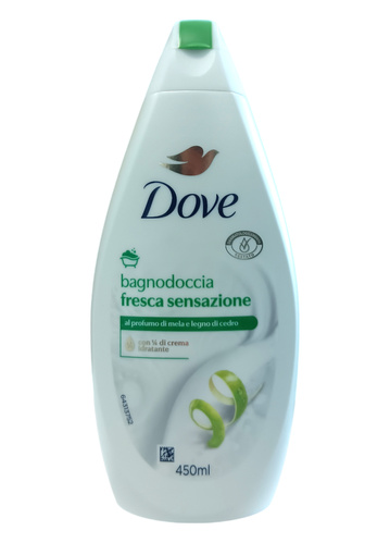 Dove Fresca Sensazione żel pod prysznic o świeżym zapachu jabłka i drewna cedrowego. Zawiera krem nawilżający, który przyczynia się do zachowania jędrności i gładkości skóry po każdym zastosowaniu. Testowany dermatologicznie.