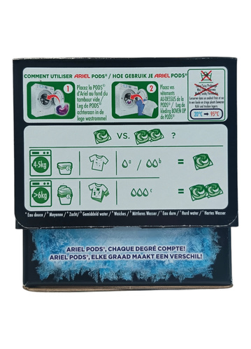 ARIEL kapsułki do prania ciemnych i czarnych tkanin. Chronią kolory przed blaknięciem. Dogłębnie czyszczą tkaninę. Nie należy stosować do prania wełny i jedwabiu. Zakres temperatur 20-95 st. C.