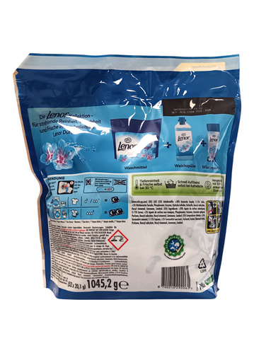 Lenor uniwersalne kapsułki przeznaczone do prania białych i kolorowych tkanin, z wyjątkiem wełny i jedwabiu. Zapewnia głęboką czystość i świeżość nawet przy praniu w niskiej temperaturze. Pozostawia świeży zapach. Zakres temperatury 20-95 st. C.