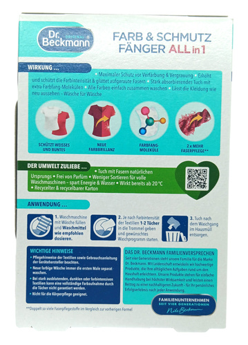 Dr Beckmann chłonne chusteczki z formułą pochłaniającą i pielęgnującą kolory. Doskonale chronią przed przebarwieniami i szarzeniem. Zwiększają intensywność kolorów i wygładzają szorstkie włókna. Skuteczne w niskich temperaturach takich jak 20 st. C.