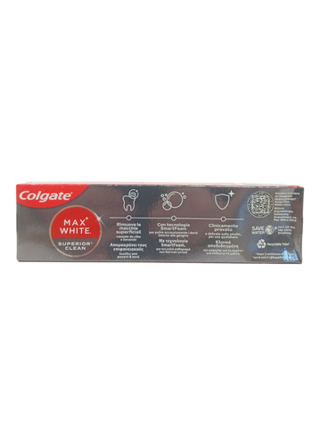 Colgate Max White Superior Clean pasta do zębów do codziennego stosowania. Usuwa powierzchowne plamy z jedzenia i napojów. Dokładnie czyści zęby wokół dziąseł. Delikatna dla szkliwa.