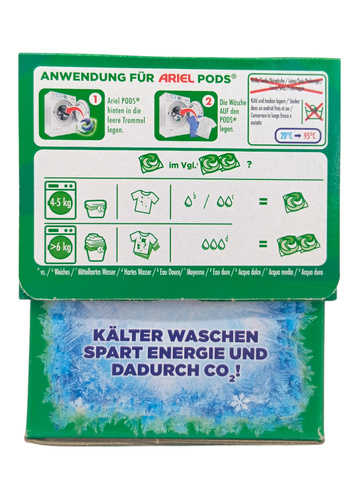 ARIEL uniwersalne kapsułki do prania. Skutecznie usuwają plamy nawet w zimnej wodzie i neutralizują zapachy. Nie stosować do prania wełny, jedwabiu oraz prania ręcznego i wstępnego. Zakres temp. 20-95 st. C.
