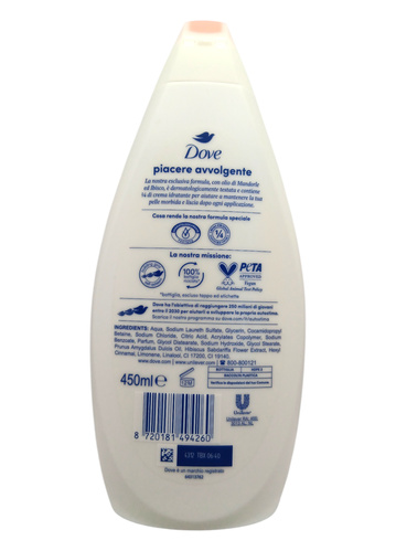 Dove żel pod prysznic z olejkiem migdałowym i hibiskusem. Zawiera krem nawilżający, który przyczynia się do zachowania jędrności i gładkości skóry po każdym zastosowaniu. Testowany dermatologicznie.